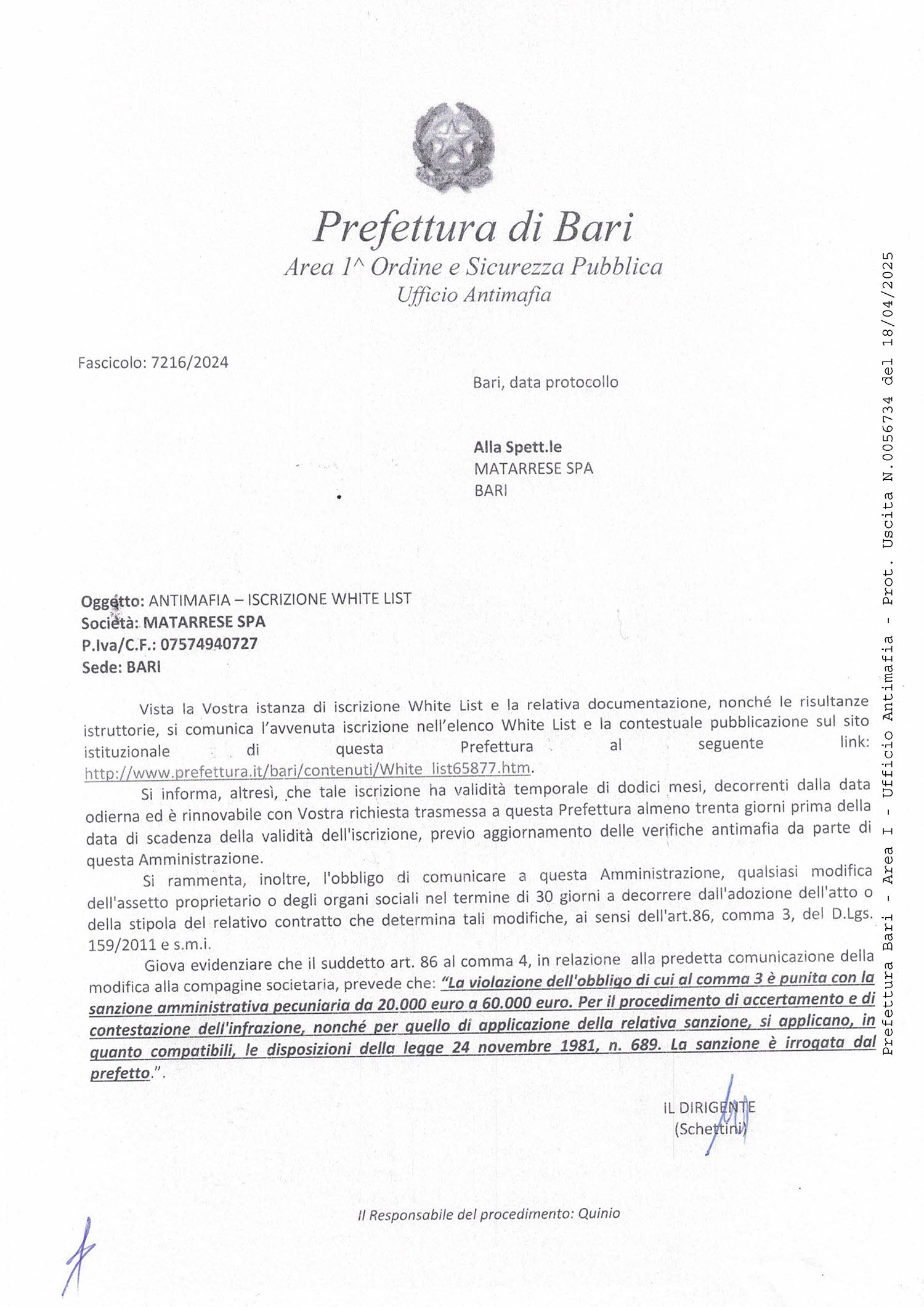 Impresa iscritta presso white list della Prefettura di Bari